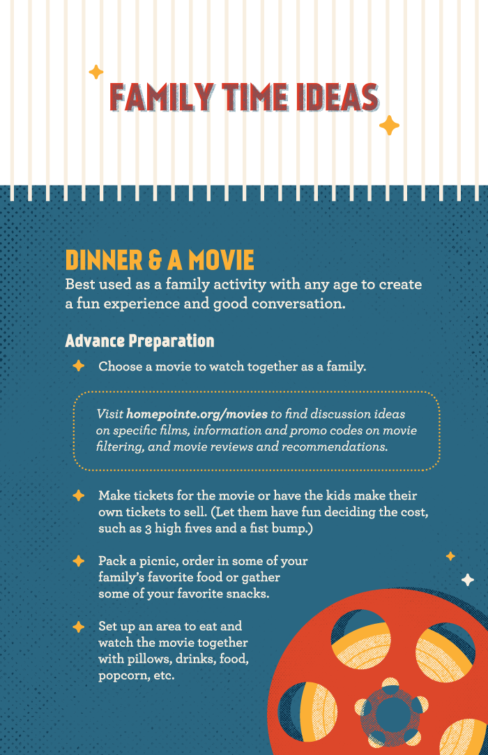 Not every film is worth watching. Select a film that can trigger meaningful discussion around values and topics that are important to your family. Consider using a movie filtering service or previewing before watching with the family so you can skip offensive scenes and prepare for the chat.
