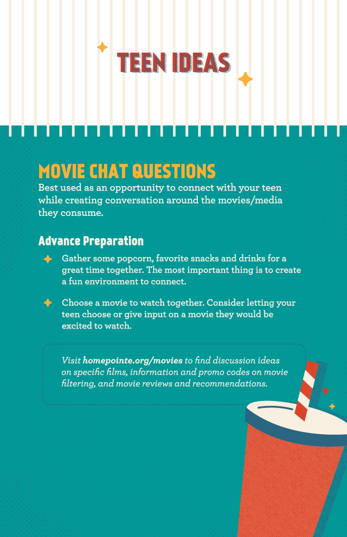 - Don’t limit your chats to films that affirm your faith. Movies that oppose Christian beliefs can trigger great discussion, especially with mature teens.